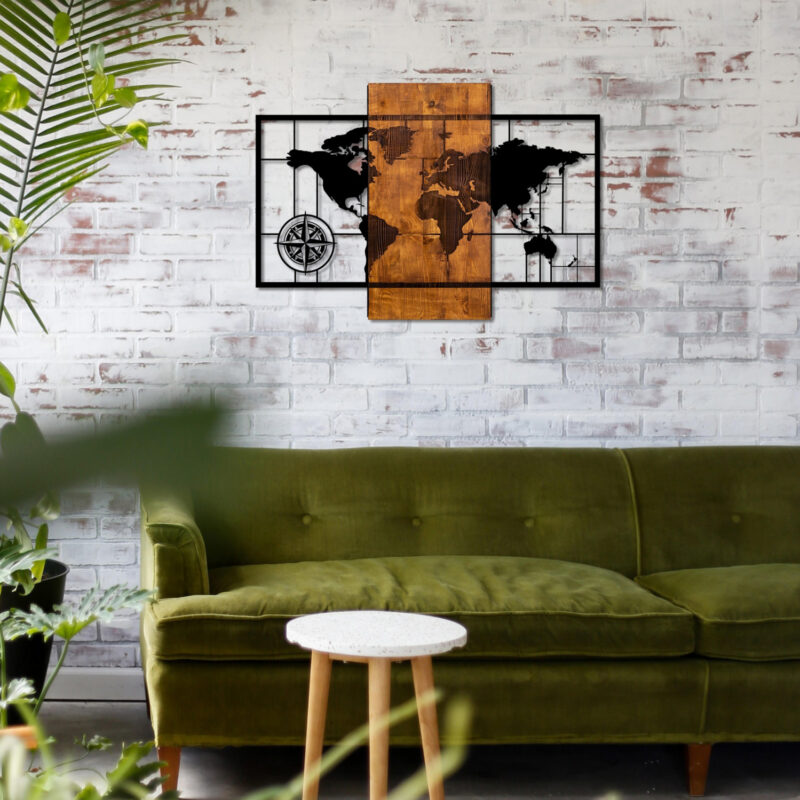 Уникален дизайн с черна карта на света, частично върху естествено дърво
