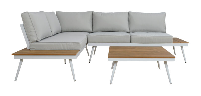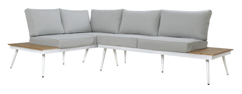 Елегантен ъглов диван в сиво с алуминиева рамка в бяло и поливуд детайли в дървесен цвят