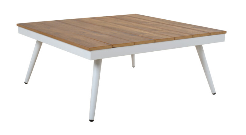 Съвременна маса с тъмносива алуминиева рамка и поливуд плот в дървесен цвят