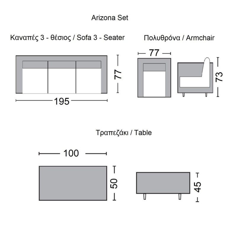 Комплект ARIZONA (Маса+3-Местен Диван+2 Фотьойла) – Сивокафяв ратан, възглавници антрацит