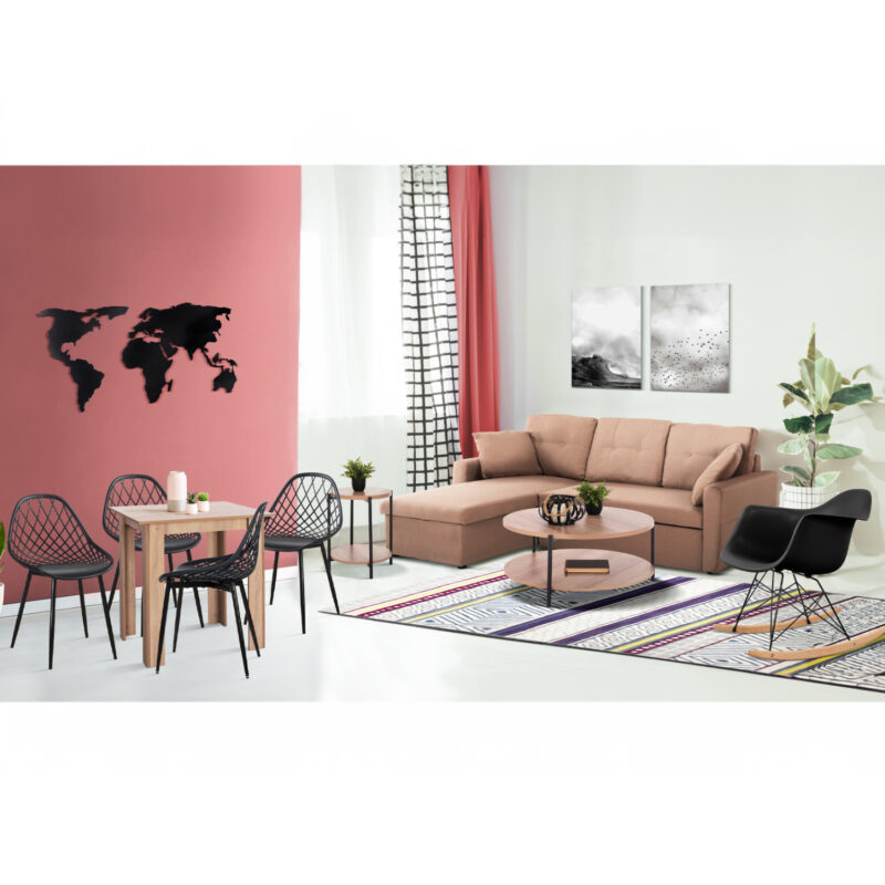 Този комплект включва ъглов диван-легло, масичка за кафе, помощна масичка, люлеещ се стол, кухненска маса и 4 стола!