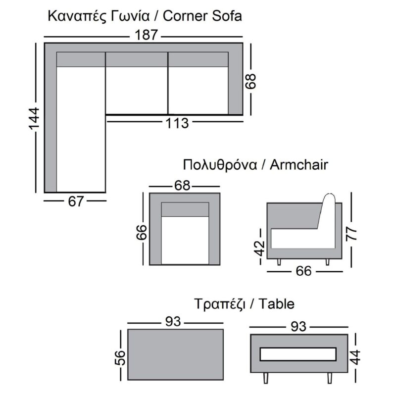 Е6865 ПАТИО Комплект Метал (Десен Ъглов Диван + Маса + Фотьойл) Плетена Сива/Възглавници Тъмно Сиви